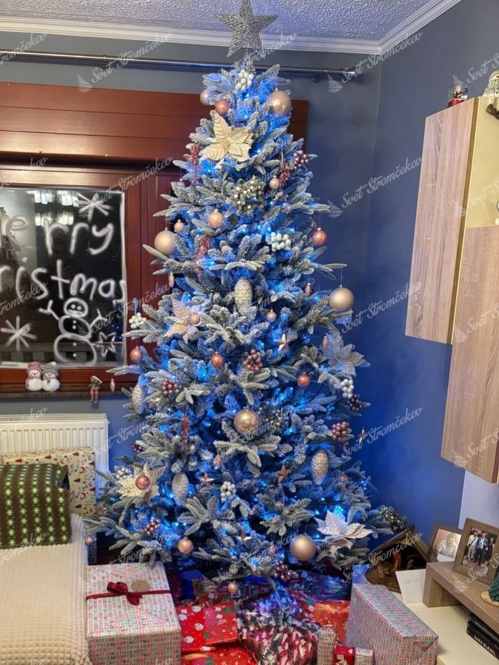 Choinka została wykonana z połączenia realistycznego igliwia PE oraz klasycznych gałązek PVC. Taka kombinacja zapewnia gęstość, trwałość oraz naturalny wygląd. Środkowa część drzewka składa się z ciemnozielonego igliwia, a końcówki gałązek są intensywnie oszronione.