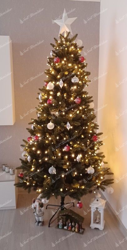 Sztuczna choinka jak żywa 100% PE, wysokość 210 cm, szerokość 125 cm, typ igliwia – 100% PE, ciemnozielone igły jodły PE, wykonanie – gęste, długość czubka – 20 cm, stojak – metalowy, ilość części – 3