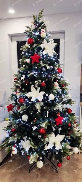 Choinka sztuczna jak żywa PE Jodła Ośnieżona to wyjątkowy model, który zachwyca swoim tradycyjnym wyglądem i bogato ośnieżonym wykończeniem. Gęste gałązki pokryte realistycznym śniegiem, ozdobione naturalnie wyglądającymi szyszkami i leśnymi owocami tworzą niezwykle efektowną i przytulną dekorację – to idealna choinka sztuczna jak żywa, która wnosi do wnętrza magię świąt.