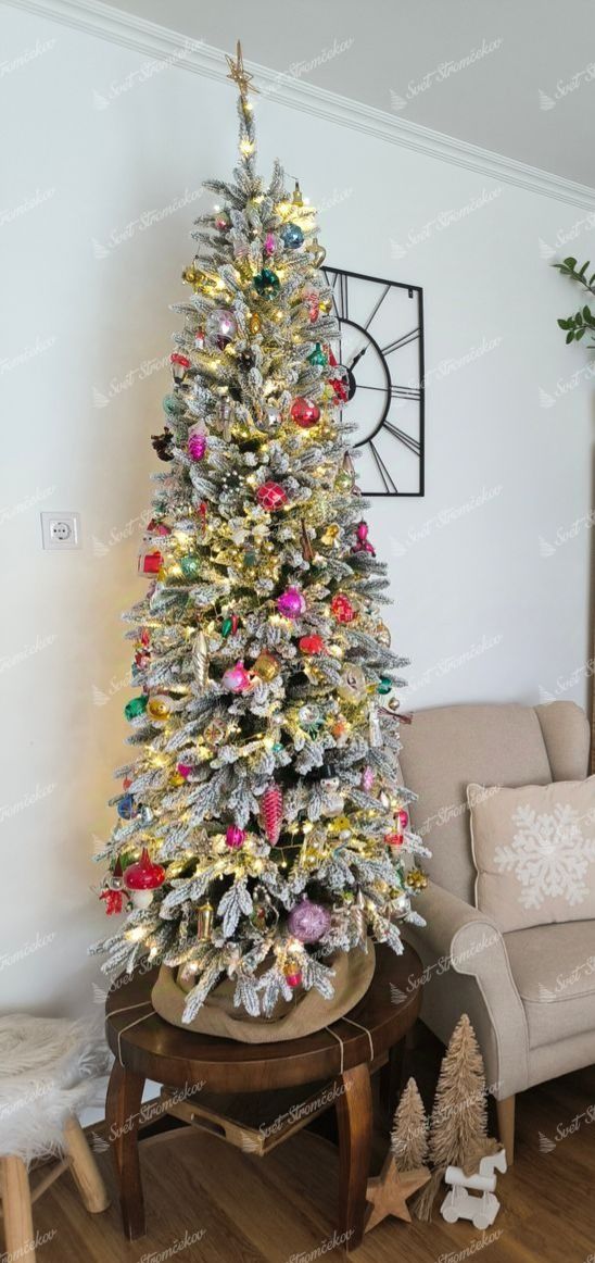 Ten smukły model idealnie nadaje się do mniejszych przestrzeni, gdzie standardowe choinki zajmują zbyt dużo miejsca. Pomimo węższej konstrukcji, choinka wygląda bardzo okazale i tworzy efektowny punkt centralny świątecznej dekoracji.