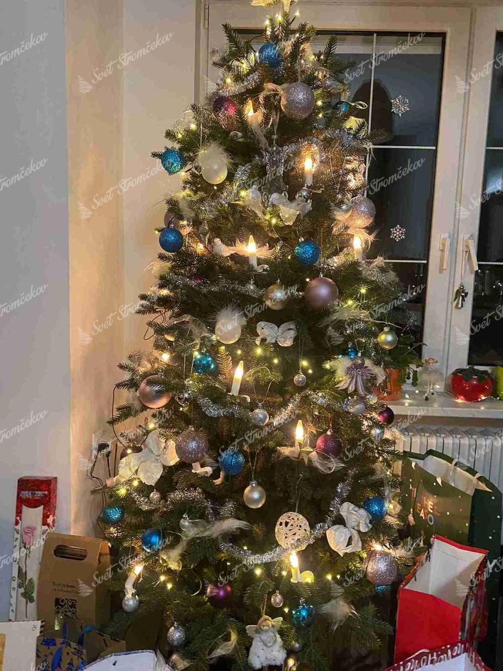 Realistyczne PE gałązki w naturalnym odcieniu zieleni zostały uzupełnione w centralnej części choinki klasycznymi gałązkami z PVC, co zapewnia jej gęsty i pełny wygląd. Gałązki są równomiernie rozmieszczone, a ich formowanie ułatwia system rozkładania typu parasol, który pozwala w szybki sposób uzyskać perfekcyjny kształt choinki.