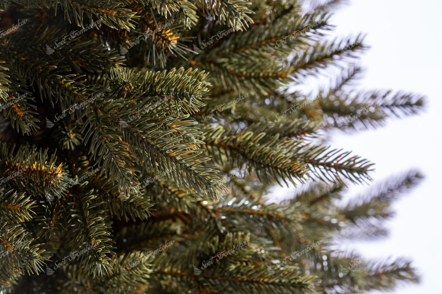Realistyczne PE gałązki w naturalnym odcieniu zieleni zostały uzupełnione w centralnej części choinki klasycznymi gałązkami z PVC, co zapewnia jej gęsty i pełny wygląd. Gałązki są równomiernie rozmieszczone, a ich formowanie ułatwia system rozkładania typu parasol, który pozwala w szybki sposób uzyskać perfekcyjny kształt choinki.