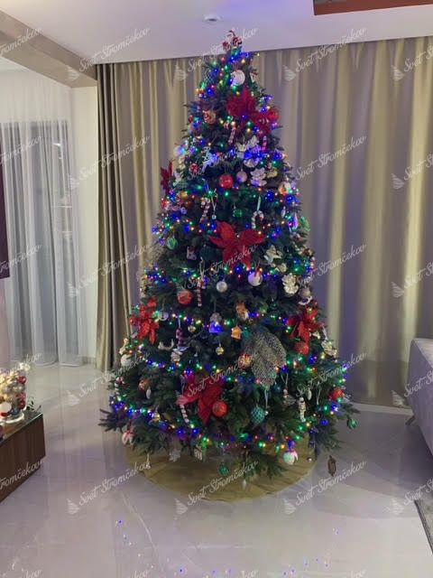 Choinka sztuczna szeroka jak żywa PE, wysokość 240 cm, szerokość 158 cm, typ igliwia – PE + PVC, jasnozielone igły jodłowe PE, wykonanie – ekstra gęste, długość czubka 20 cm, stojak metalowy, ilość części – 3
